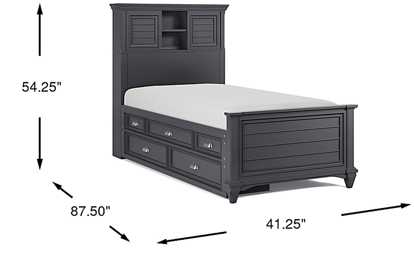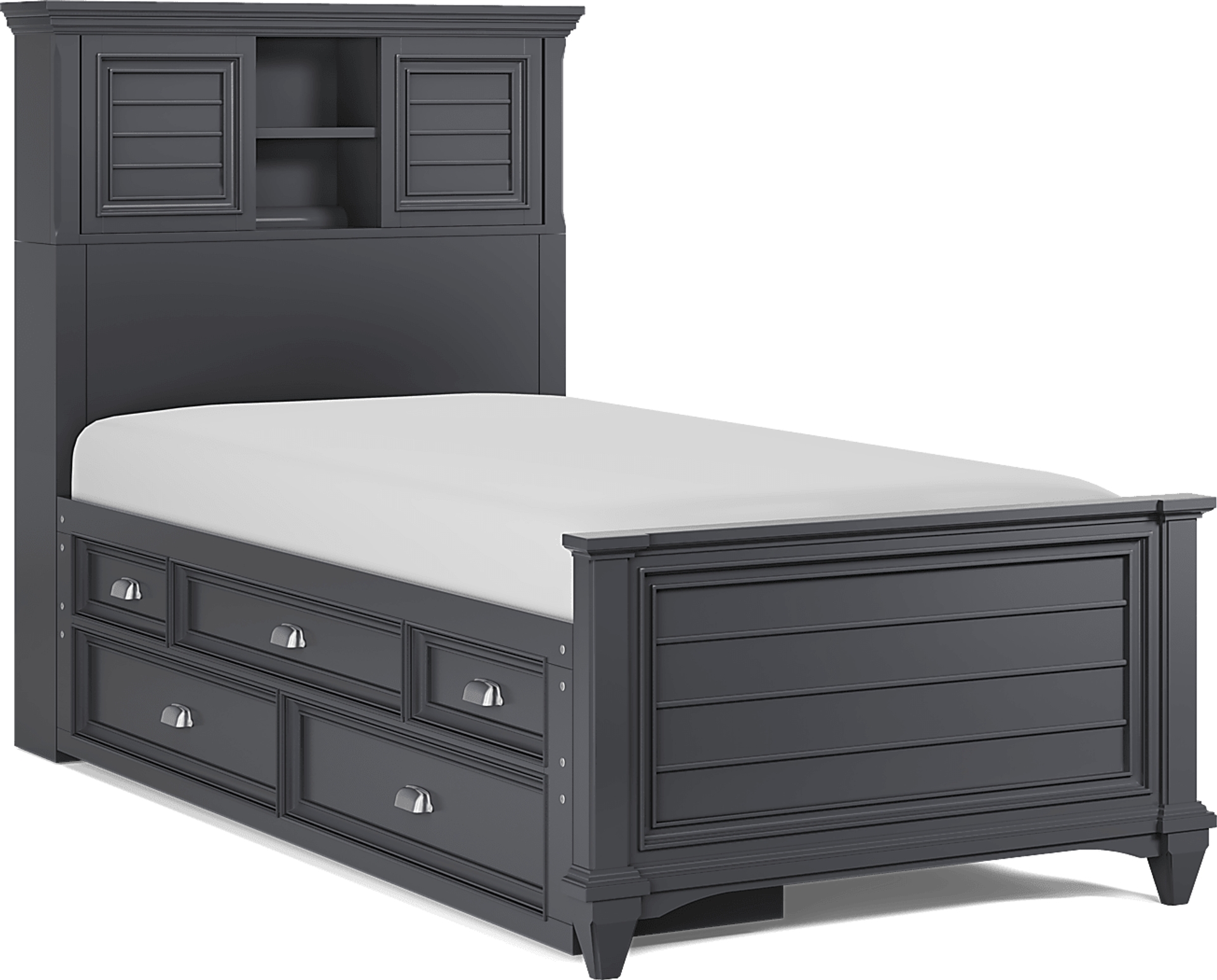 The Hilton Head bookcase bed is perfect for your bookworm, collector and every kid in-between. The timeless style of this bed is coupled with convenient built-in shelving in the headboard that helps keep everything at arm's reach and a footboard that features a shutter look. Two sliding panels on tracks provide a mix of concealed and display storage while built-in wire management holes prevent clutter. The versatile graphite finish helps this bed fit in with many decor styles, while the combination of wood products and solid wood molding makes for a quality piece to center any child's room. The storage side rail has brushed nickel pulls alongside decorative moldings that create a spectacular under the bed storage solution for either side of the twin bed. Featuring five drawers, this piece is designed to provide quick and convenient access to bedtime essentials with plenty of room for blankets, pajamas and more. Mattress and foundation (if required) sold separately.