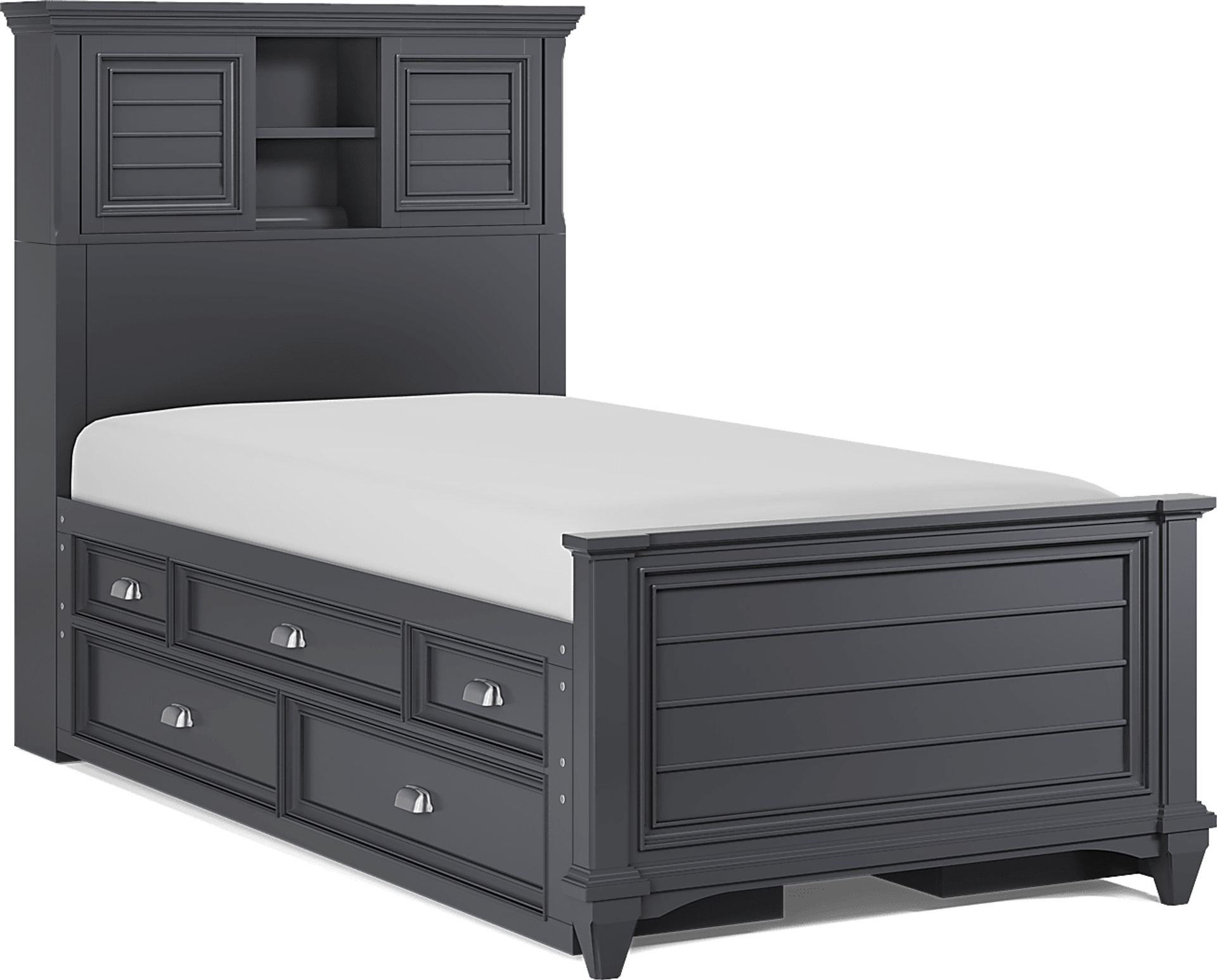 The Hilton Head bookcase bed is perfect for your bookworm, collector and every kid in-between. The timeless style of this bed is coupled with convenient built-in shelving in the headboard that helps keep everything at arm's reach and a footboard that features a shutter look. Two sliding panels on tracks provide a mix of concealed and display storage while built-in wire management holes prevent clutter. The versatile graphite finish helps this bed fit in with many decor styles, while the combination of wood products and solid wood molding makes for a quality piece to center any child's room. The storage side rails have brushed nickel pulls alongside decorative moldings that create a spectacular under the bed storage solution on both sides of the twin bed. Featuring five drawers, both pieces are designed to provide quick and convenient access to bedtime essentials with plenty of room for blankets, pajamas and more. Mattress and foundation (if required) sold separately.
