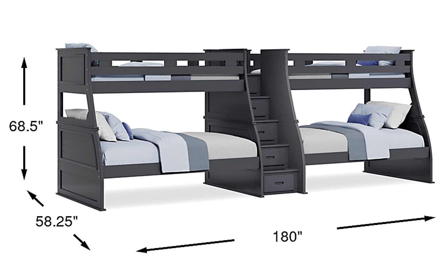 Given its expansive design, this unit requires a significant footprint, measuring 180 inches in width (exactly 15 feet). It is best suited for long, unobstructed walls in larger bedrooms or dedicated bunk rooms. We recommend measuring your space carefully to ensure the 15-foot width and 68.5-inch height fit comfortably within your room’s dimensions while allowing for safe clearance around the unit.