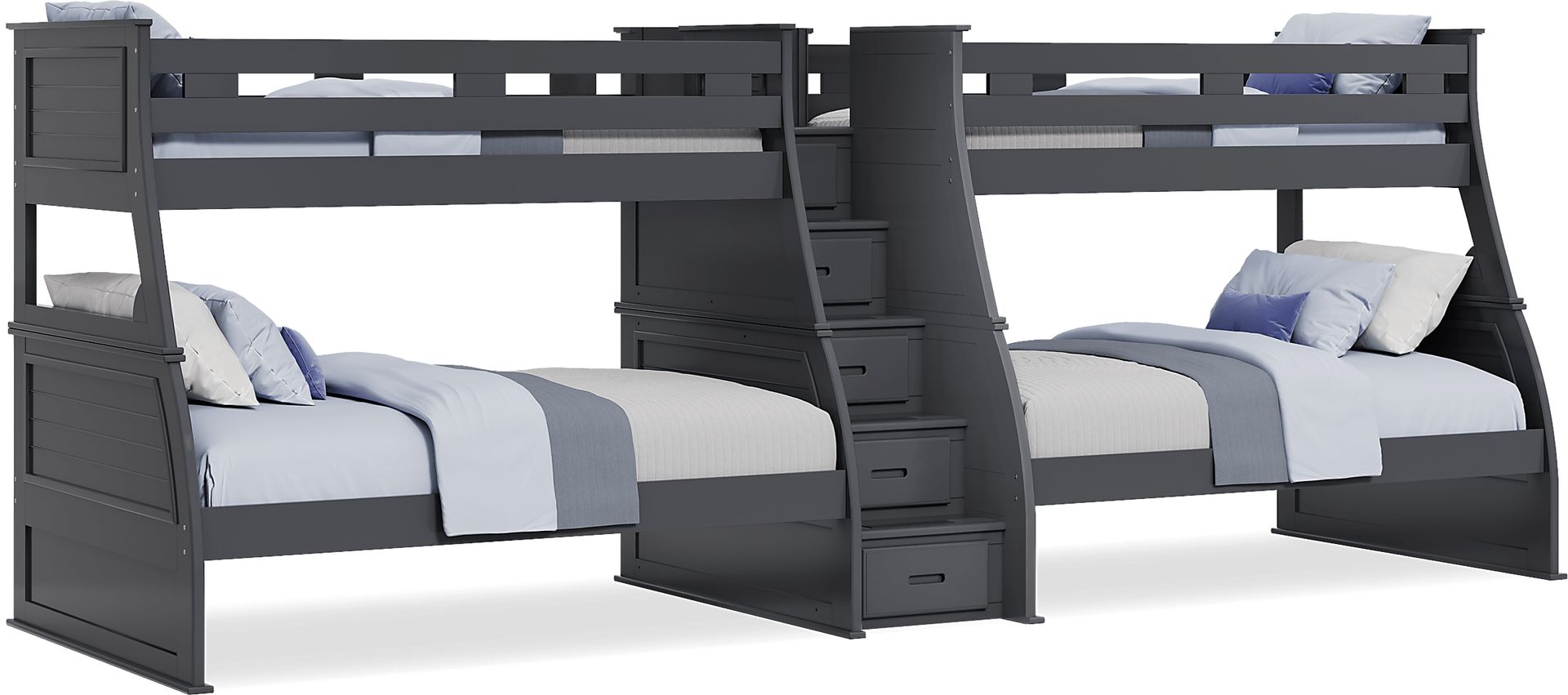 Double on up sweet bedtime style with the Hilton Head double bunk bed. With a cool design that features a pair of twin beds over a pair of full beds, this double bunk sleeps up to four children. The center steps feature built-in storage for clothes, books and more. The coastal shutter look is highlighted by the cool, charcoal finish. Mattresses and foundations sold separately. This product requires bunkie boards (sold separately). Trundle not included.