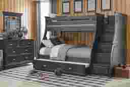 Complete your child's room with the cool and convenient Hilton Head bunk. With a classic design that features a unique shutter look and a beautiful graphite finish, this bunk is sure to be a hit. The bunk has a twin over full configuration provides ample space for two kids and an optional storage trundle can add an extra bed for sleepovers or additional storage. This bunk swaps the ladder for stylish steps that have built-in storage drawers. This product requires a bunkie board (sold separately) Mattress and foundation (if required) sold separately.