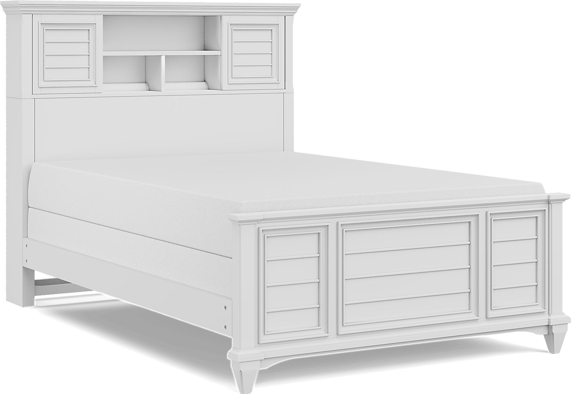 The Hilton Head bookcase bed is perfect for your bookworm, collector and every kid in-between. The timeless style of this bed is coupled with convenient built-in shelving in the headboard that helps keep everything at arm's reach and a footboard that features a shutter look. Two sliding panels on tracks provide a mix of concealed and display storage while built-in wire management holes prevent clutter. Finished with a versatile white paint, this bed is a great centerpiece for your child's bedroom. Mattress and foundation (if required) sold separately.
