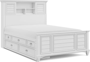 The Hilton Head bookcase bed is perfect for your bookworm, collector and every kid in-between. The timeless style of this bed is coupled with convenient built-in shelving in the headboard that helps keep everything at arm's reach and a footboard that features a shutter look. Two sliding panels on tracks provide a mix of concealed and display storage while built-in wire management holes prevent clutter. The versatile white finish helps this bed fit in with many decor styles, while the combination of wood products and solid wood molding makes for a quality piece to center any child's room. The storage side rail has brushed nickel pulls alongside decorative moldings that create a spectacular under the bed storage solution for either side of the full bed. Featuring five drawers, this piece is designed to provide quick and convenient access to bedtime essentials with plenty of room for blankets, pajamas and more. Mattress and foundation (if required) sold separately.
