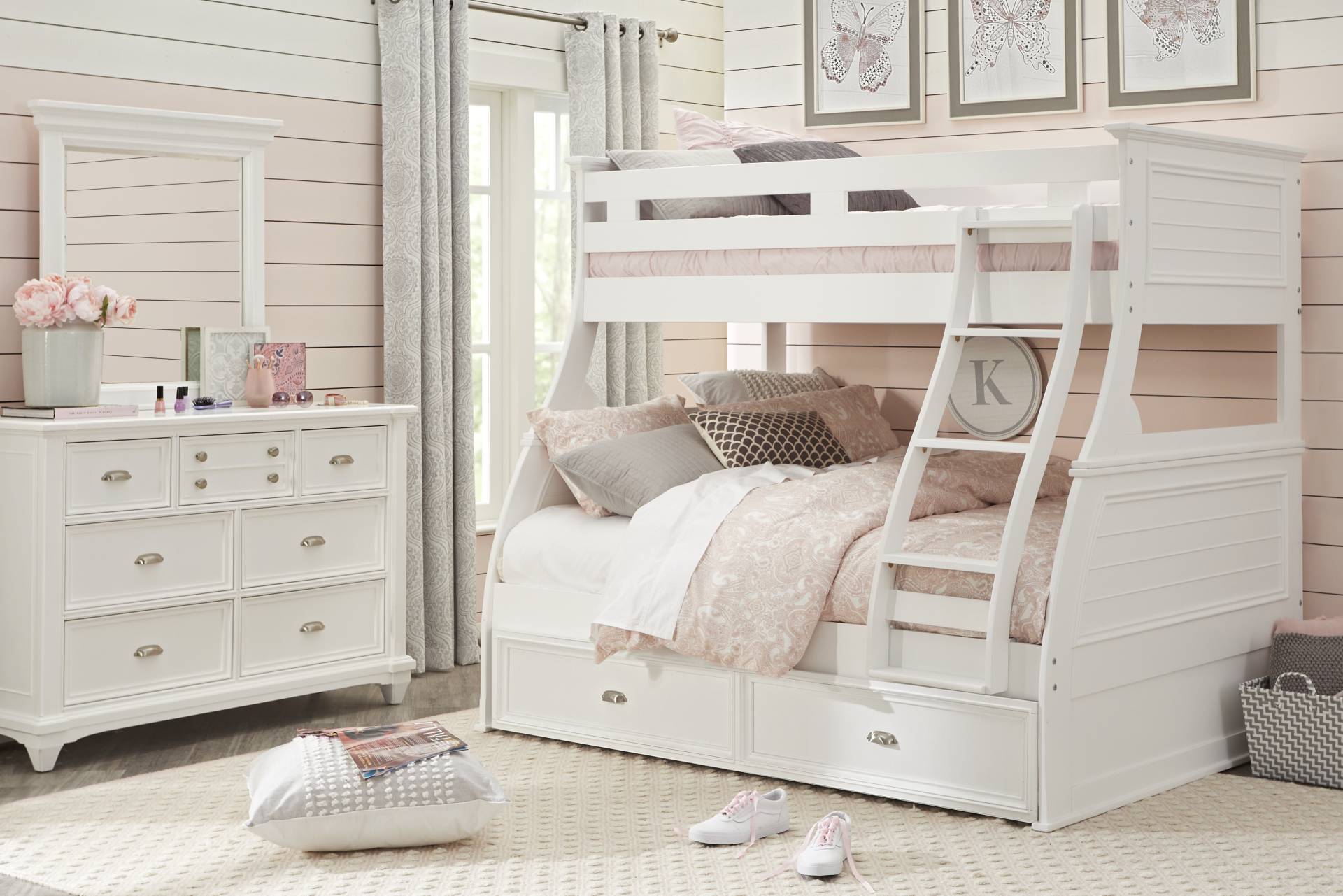 Complete your child's room with the cool and convenient Hilton Head bunk. With a classic design that features a unique shutter look and a beautiful white finish, this bunk is sure to be a hit. The bunk has a twin over full configuration provides ample space for two kids and an optional storage trundle can add an extra bed for sleepovers or additional storage. Mattresses and foundations sold separately. This product requires a bunkie board (sold separately).
