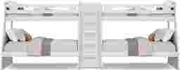 Double on up sweet bedtime style with the Hilton Head double bunk bed. With a cool design that features a pair of twin beds over a pair of full beds, this double bunk sleeps up to four children. The center steps feature built-in storage for clothes, books and more. The coastal shutter look is highlighted by the luminous tone of the bright white finish. Mattresses and foundations sold separately. This product requires bunkie boards (sold separately). Trundle not included.