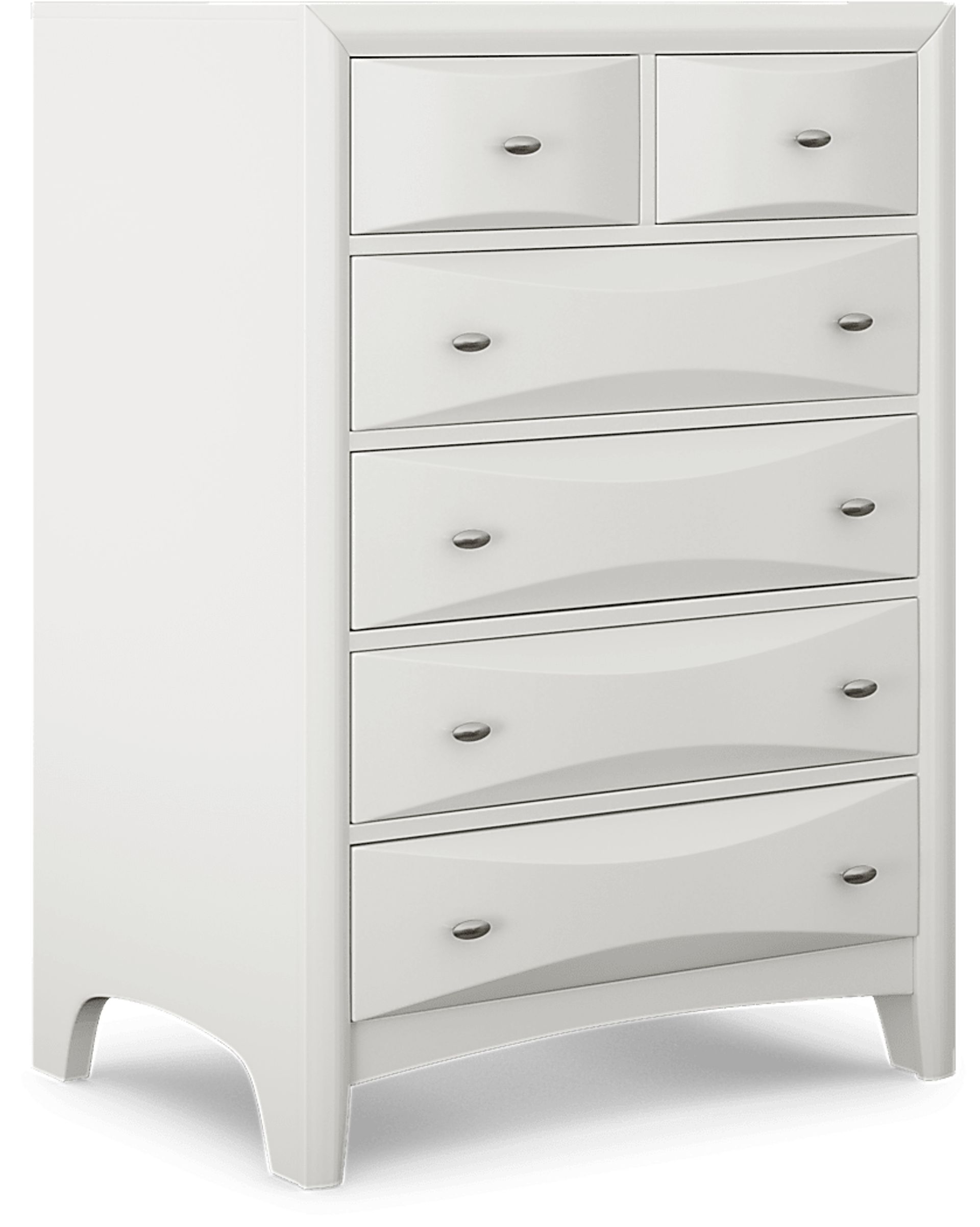 Keeping your kid's room neat is easier with the Ivy League 2.0 chest. Its classic white finish and contemporary styling make it an irresistible addition to the room. Crafted of poplar solids, six beveled drawers provide generous storage for all types of clothes. Brushed nickel pulls and shaped feet add design interest, while French dovetail drawer construction adds an additional quality touch.