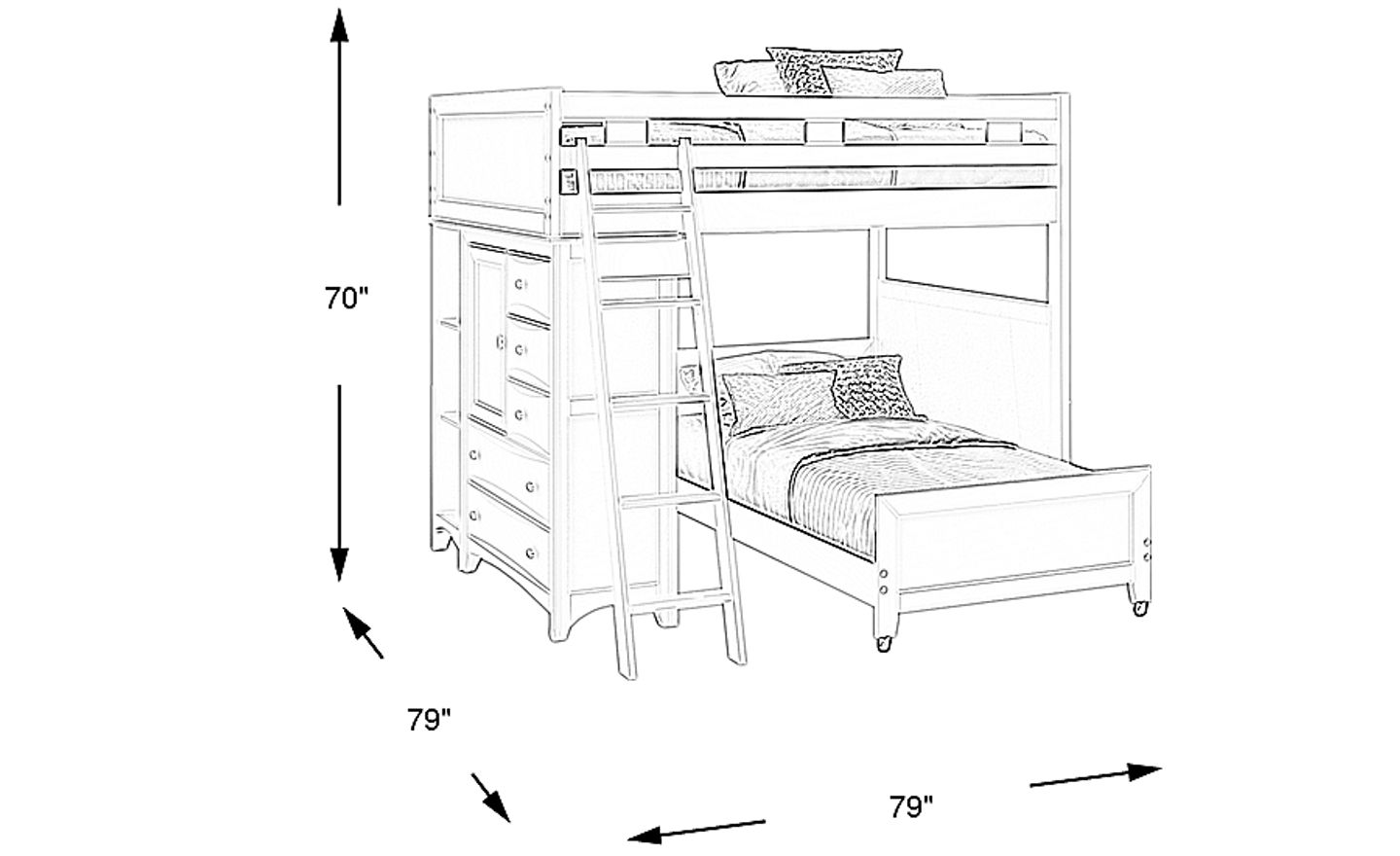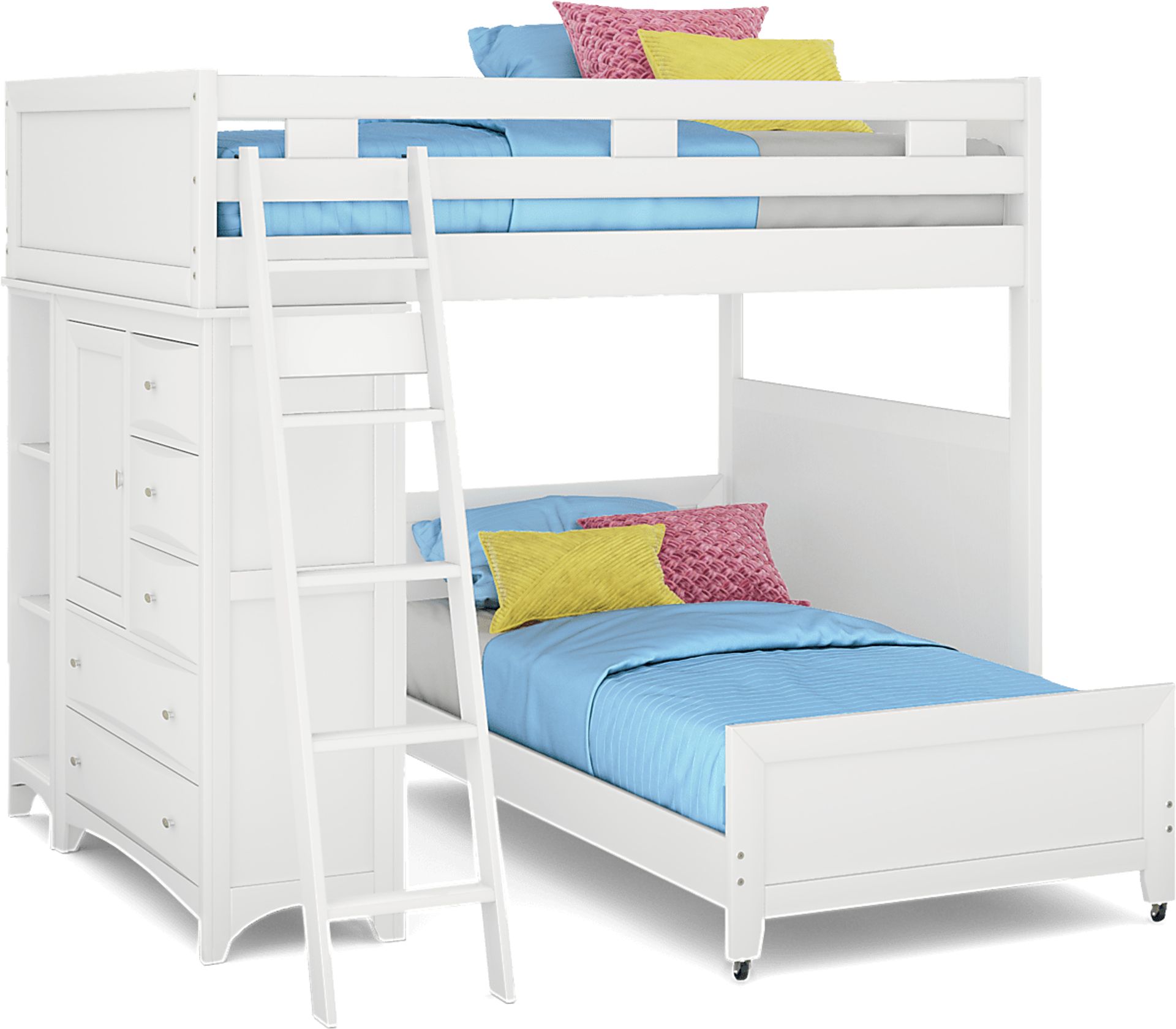 The Ivy League full over twin loft makes the most of the space in your child's bedroom. On one side you'll find a storage chest with five beveled drawers and brushed steel hardware and adjustable shelves fronted by a door with a built-in bookcase. The twin bottom bed is on casters so it can be moved easily. Durable construction is complemented by a beautiful white finish. Mattress and foundation (if required) sold separately. Bunkie board required. Bed shown is twin/twin