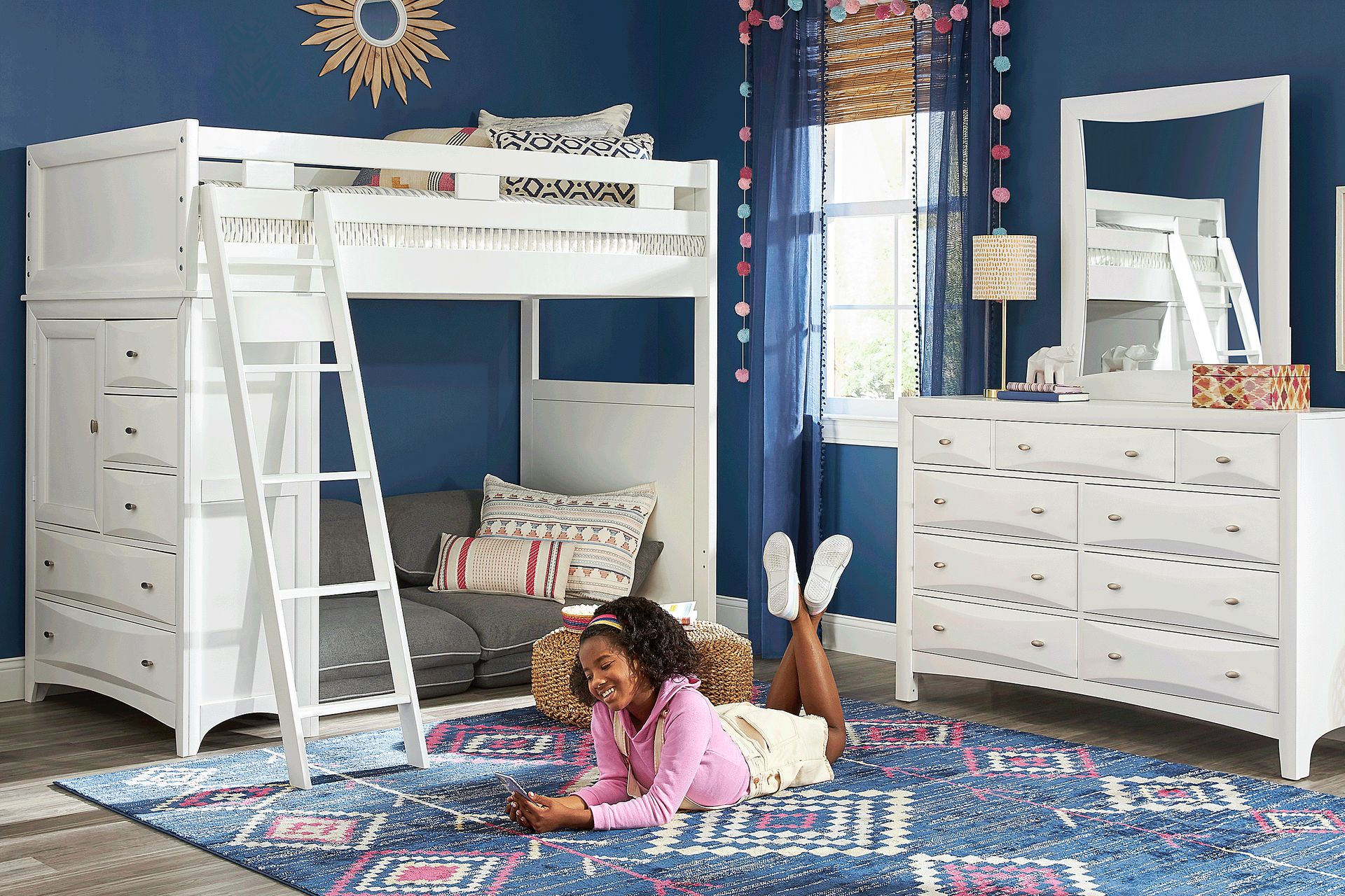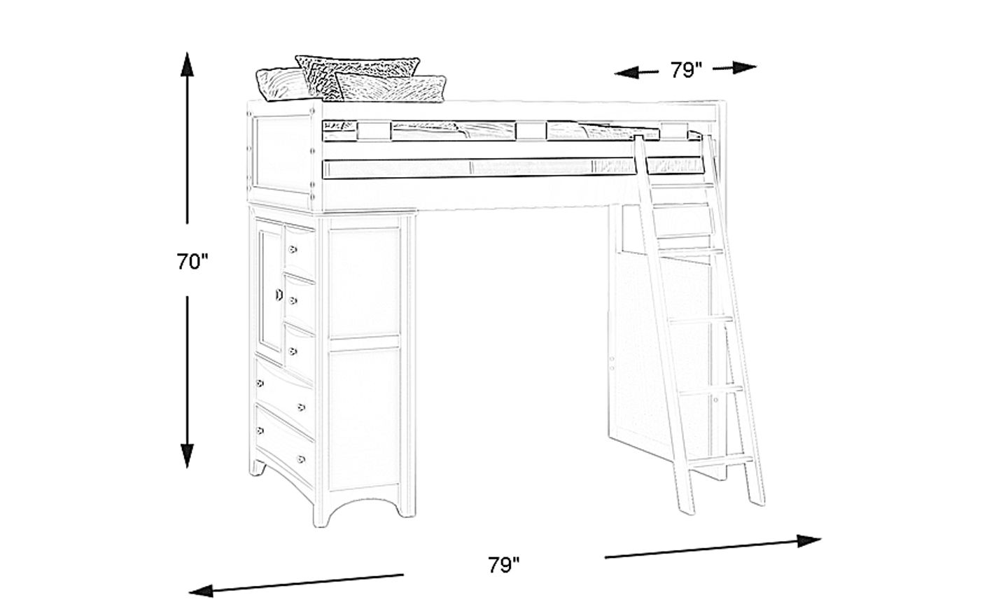 The Ivy League 2.0 twin loft makes the most of the space in your child's bedroom. On one side you'll find a storage chest with five beveled drawers and brushed steel hardware and adjustable shelves fronted by a door. Durable construction is complemented by a beautiful white finish. Mattress and foundation (if required) sold separately. Bunkie board required.