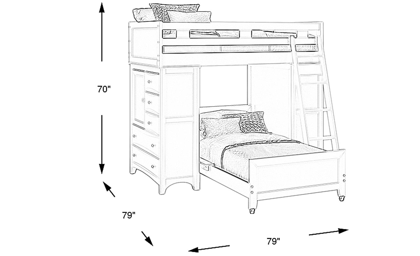 With a total height of approximately 70 inches, this loft bed is designed to fit comfortably in rooms with standard 8-foot (96-inch) ceilings. This configuration leaves roughly 26 inches of clearance between the top of the bed and the ceiling, allowing a child to sit up comfortably. For smaller urban apartments or narrow bedrooms, the compact footprint efficiently consolidates two beds and ten storage drawers into one area, maximizing available floor space.