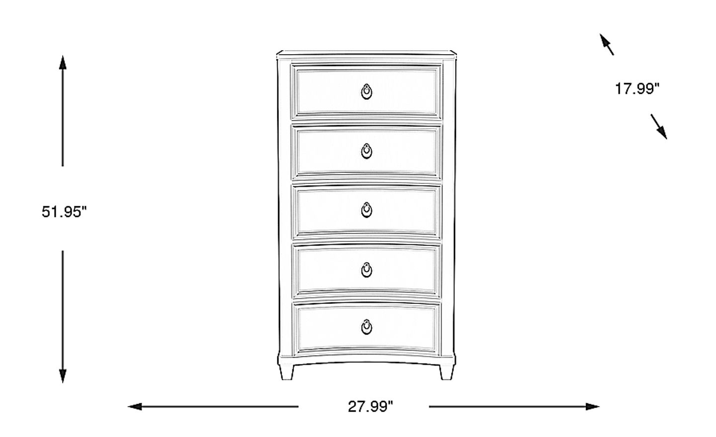 A well-rounded style defined by beautiful flourishes, the Jaclyn Lane chest is perfect for kids and teens alike. Crafted with birch veneers in majestic black finish, the piece features an elegantly curved front and is equipped with five soft-closing drawers. Each drawer is constructed with French dovetail joints in the front and English dovetail joints in the back for enhanced durability. The bottom drawer of the piece is dust proof, helping to prevent debris from dirtying up clean clothes. The look and feel of the soft gold hardware gives the chest a timeless final touch.