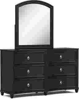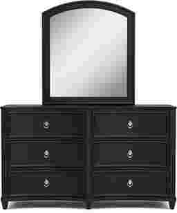A well-rounded style defined by beautiful flourishes, the Jaclyn Lane dresser and mirror set is perfect for kids and teens alike. Crafted with birch veneers in majestic black finish, the dresser features an elegantly curved front and is equipped with six soft-closing drawers. Each drawer is constructed with French dovetail joints in the front and English dovetail joints in the back for enhanced durability. The bottom drawer is dust proof, helping to prevent debris from dirtying up clean clothes. The look and feel of the soft gold hardware gives the dresser a timeless final touch. Completing the set, the coordinating mirror mounts to the dresser.