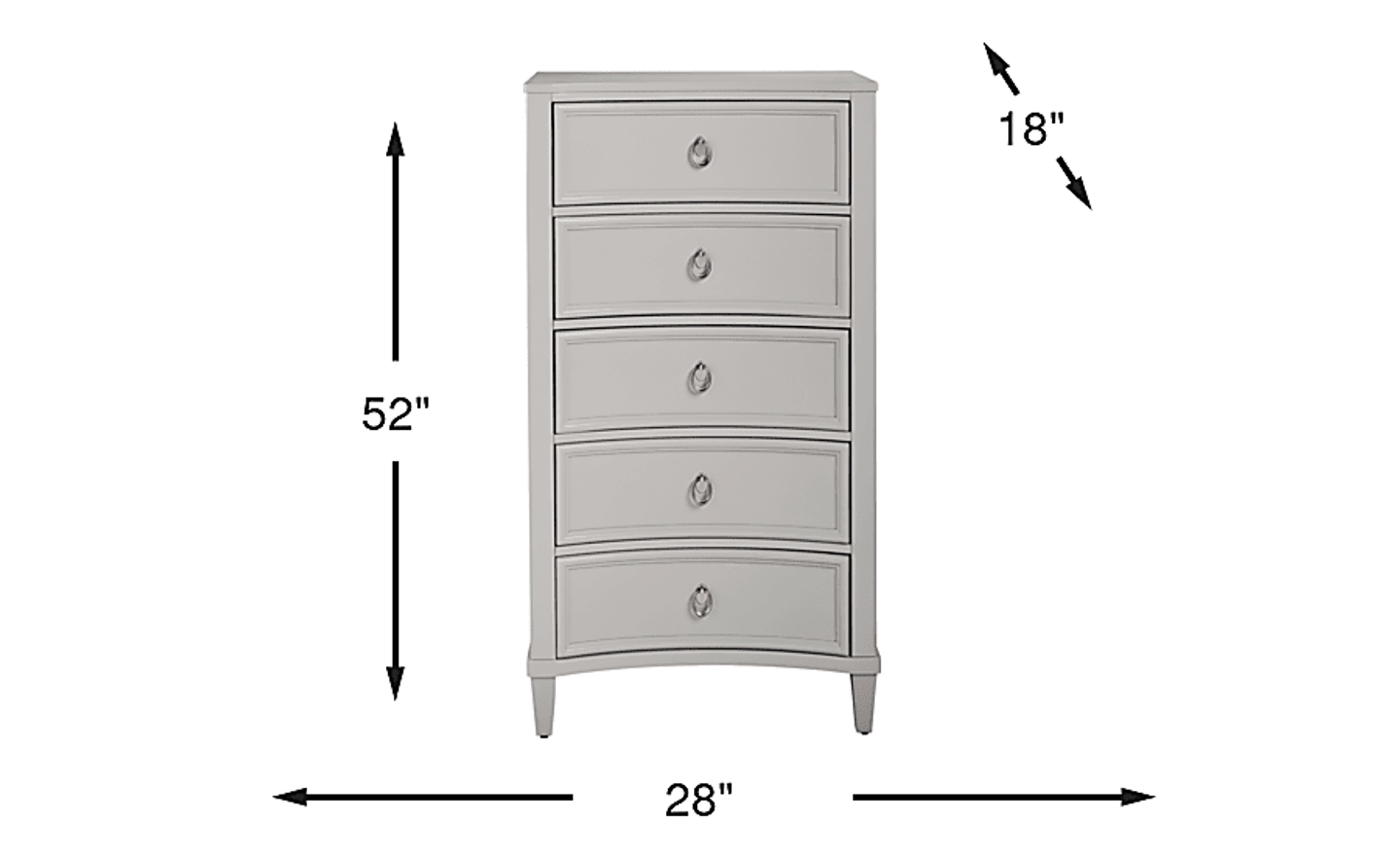 With an attractive gray finish, the Jaclyn Place chest is a stylish and chic solution for clothes and bedside clutter. Constructed of poplar solids and birch veneers, this five drawer chest boasts ample space for clothes and other small items. Featuring brushed nickel hardware with elegant looped drawer pulls, this chest also utilizes French and English dovetail drawer construction for sturdiness. With a felt lined upper drawer and dust proof bottom panel, it's the perfect place to hold all of your most delicate clothing and accessories.