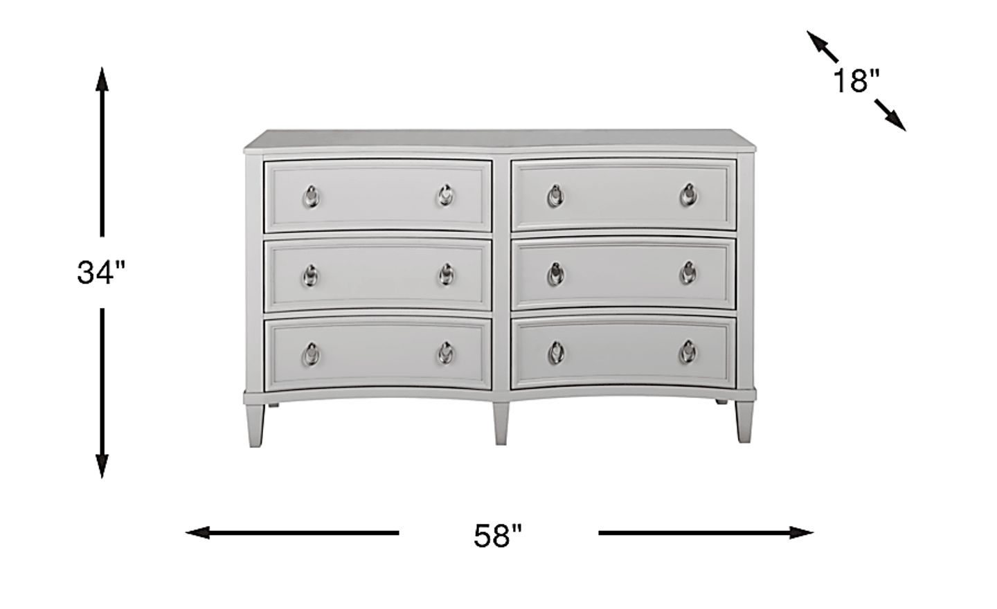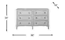A perfect complement to the Jaclyn Place mirror, the Jaclyn Place dresser is a stylish and chic solution to clothes clutter. Constructed of poplar solids and birch veneers in a chic gray finish, this six drawer dresser boasts ample space for clothes and other small items. Featuring brushed nickel hardware with elegant looped drawer pulls, this dresser also utilizes French and English dovetail drawer construction for sturdiness. With felt lining in the upper drawers, and dust proof bottom panels, this piece is the perfect place to hold all of your most delicate clothing and accessories.