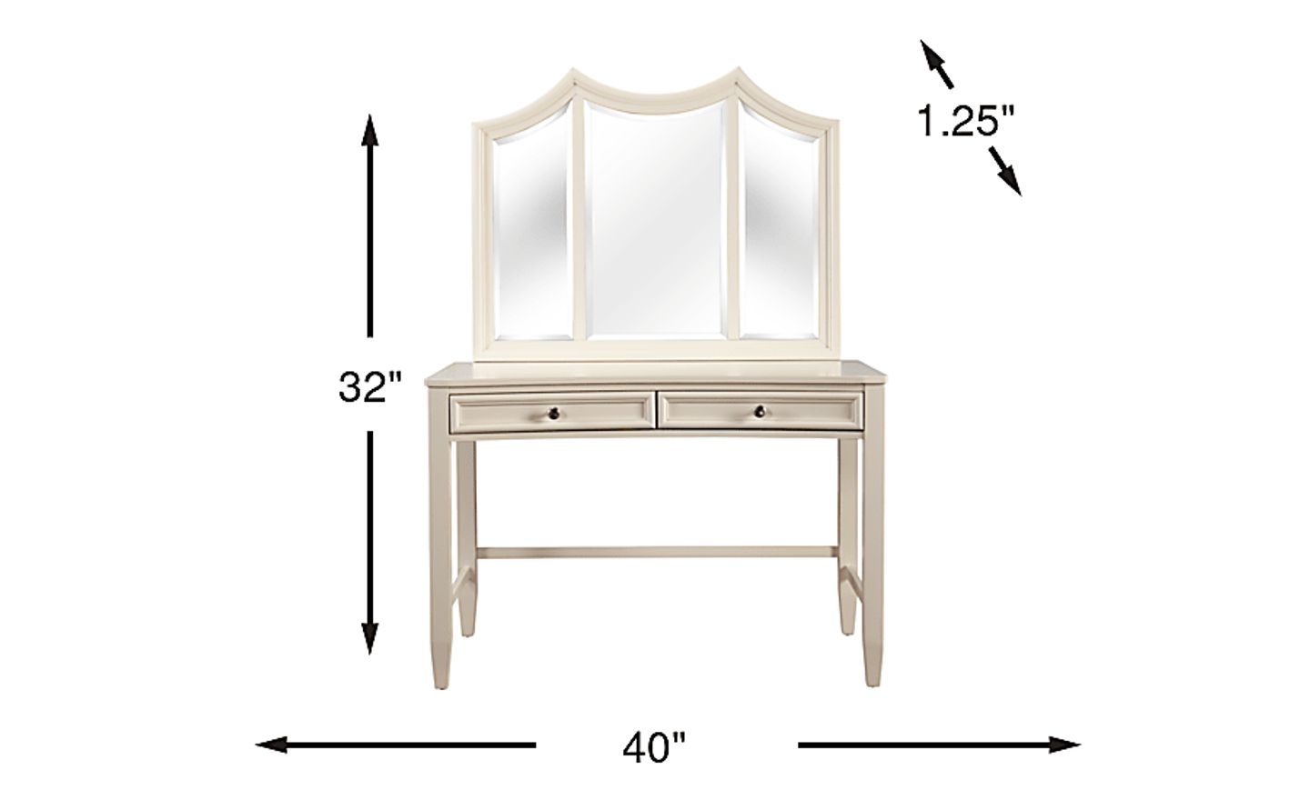 The Jaclyn Place desk with vanity mirror is perfect as a stylish and chic study area or vanity. Both the mirror and desk are constructed of poplar solids and birch veneers in a beautiful ivory finish. The two drawer desk is perfect for storing loose papers and books, or even makeup and jewelry, and also features brushed nickel hardware. The beveled mirror is comprised of three sweet curves that add plenty of visual appeal.