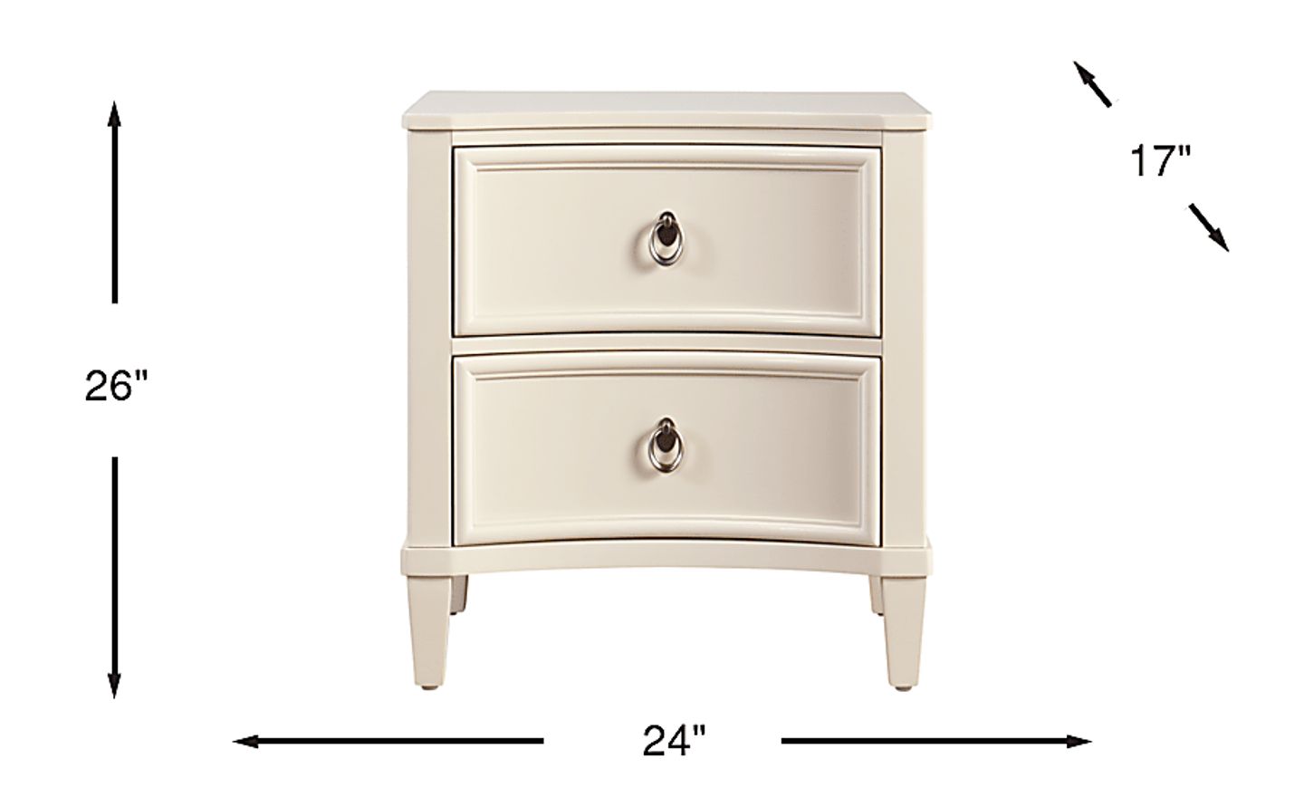 The Jaclyn Place nightstand is the perfect solution for keeping things close by, yet organized. Stylish and affordable, this nightstand offers two chic loop drawer pulls in a brushed nickel finish. Featuring elegant French and English dovetail constructed drawers, this lovely nightstand is made from poplar solids and birch veneers in a classic ivory finish.