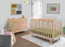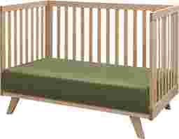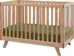 The Jemuz Convertible Crib is a stylish and versatile option for a modern nursery. It features a mid-century design with flat wooden slats and angled feet, as well as a sturdy Beech wood frame. The crib is made using solid Beech wood, which ensures durability and quality. Customer assembly is required.