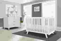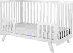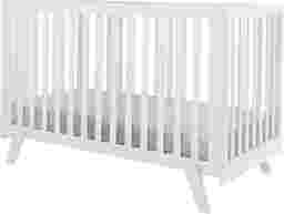 The Jemuz Convertible Crib is a stylish and versatile option for a modern nursery. It features a mid-century design with flat wooden slats and angled feet, as well as a sturdy Beech wood frame. The crib is made using solid Beech wood, which ensures durability and quality. Customer assembly is required.