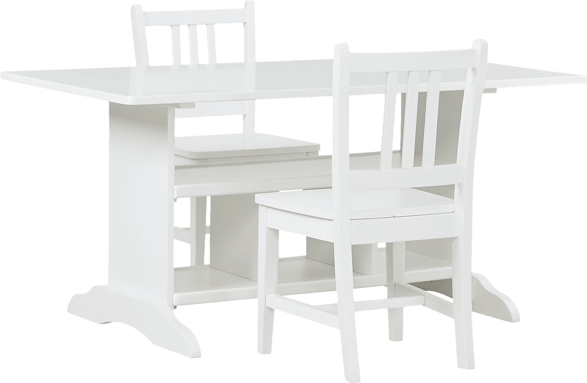 The versatile design of the Jo Jo table set makes it a great place to do just about anything. Perfectly sized with rounded edges for little ones, the ample table top is ideal for spreading out homework, working on a craft project, or enjoying a snack. Two spacious shelves built into the table's base make clean up and organization a cinch! The classic design and fresh white finish of the sturdy wooden table is paired with matching splat back chairs that look great no matter where you place it in your home. Some assembly required.