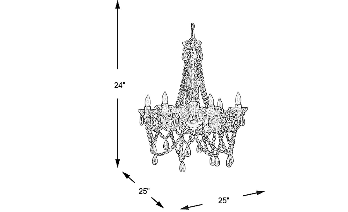 Adding pretty pizzazz at an affordable price, the Kalisa chandelier brightens up any room or playhouse with its exceptionally stylish look. Inspired by a classic Baroque design, draped bead ropes and faceted crystal-like gems catch the light when illuminated in tones of light and dark hot pink. Six 15 watt candelabra bulbs are included. All you have to do is hang the chain and plug it in with the 11.5' cord; no professional installation required. Contains small parts.