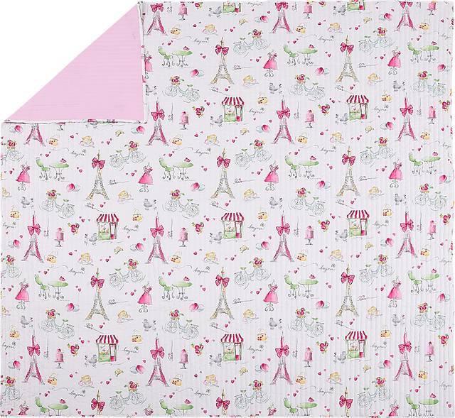 Visit Paris in your dreams with the La Parie quilt. This print features beautiful artistic renderings of Parisian fashion, cafes, and of course the iconic Eiffel Tower! The printed face reverses to a pretty pink solid. This easy care ensemble is made of super soft 100% polyester. This quilt set is complete with one matching sham. Your little mademoiselle will adore this bed. Customer assembly is required.