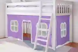 The Linnett twin low loft bed with purple curtains is the perfect combination of functional and fun that both kids and parents love. Top bed features tall 14" guardrails. Solid, knot-free New Zealand pine wood adds strength and stability. There is a 400-pound resting weight capacity per sleeping surface. Strong plywood slats with metal support bar. Ladder is both reversible and removable. Space-saving: loft design opens up floor space. Total footprint (including ladder) 81.5""L X 54.25""W X 50""H; Actual bed measurements (excluding ladder) 81.5""L X 42.5""W X 50""H. Under-bed height is 33.25"". Designed to accommodate standard twin-size mattress that is 5" thick, not to exceed 8" thick. Plywood slats included; no box spring or bunkie board required. Mattress and bedding not included. Removable curtains turn under bed area into a play-space. Includes one front panel and one side panel. Easily attaches with hook and loop fastener strip. Hand-sewn, 100% cotton. Customer assembly required.