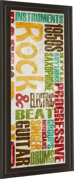 Let the music speak to you. Think of all the words that come to mind when you think of music. The Love for Rock piece is elegantly framed using a 3 inch profile made of a scratch resistant MDF in a dark chocolate color. It is framed under real glass and it is ready to hang with all the hardware pre-attached.