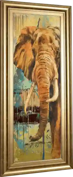 Be Safari ready and let this elephant stretch its long and beautiful trunk on a wall in your home. The beautiful Magnificent Elephant piece is 18 in. x 42 in. in size and elegantly framed using a 3 inch profile made of a scratch resistant MDF framed in a subtle gold color. It is framed under real glass and it is ready to hang with all the hardware pre-attached.
