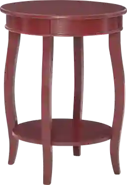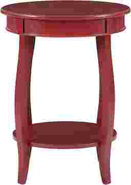The contemporary red round Maliory table with shelf is a convenient accent for any room of your home. A round lower shelf offers a convenient option for storing toys, magazines or your favorite books. Made of select hardwoods and solid wood materials, the contemporary styling of this table has a bentwood skirt and four saber cabriole tapered legs. Customer assembly is required.