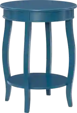 The contemporary teal round Maliory table with shelf is a convenient accent for any room of your home. A round lower shelf offers a convenient option for storing toys, magazines or your favorite books. Made of select hardwoods and solid wood materials, the contemporary styling of this table has a bentwood skirt and four saber cabriole tapered legs. Customer assembly is required.