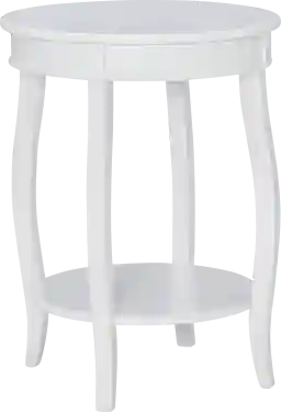 The contemporary white round Maliory table with shelf is a convenient accent for any room of your home. A round lower shelf offers a convenient option for storing toys, magazines or your favorite books. Made of select hardwoods and solid wood materials, the contemporary styling of this table has a bentwood skirt and four saber cabriole tapered legs. Customer assembly is required.