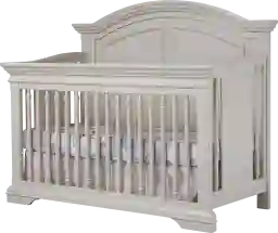 Measuring 59 inches wide and 32 inches deep, this crib follows standard sizing for full-size cribs, ensuring it fits comfortably in most nurseries while providing a safe, spacious sleep environment. The 51-inch height is primarily due to the elegant, arched solid-panel headboard, which adds a sophisticated vertical element to the room without requiring additional floor space. This standard footprint also ensures compatibility with most standard-sized crib mattresses.