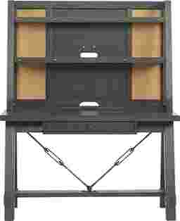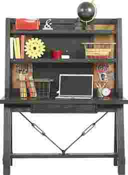 Inspired by industrial design, the Midcity Loft desk and hutch is suffused with a casual vibe that will make studying or working on a craft project an enjoyable experience. Designed with sawhorse-style legs, antiqued pewter hardware accents the charcoal gray finish. Multiple pass through holes in the hutch allow for easy access between electronic devices and wall outlets, helping your child stay clutter-free. Two removable shelves are great for books or art supplies, while two corkboard strips allow a place for displaying projects, art, or pictures of friends. Made of wood solids and hickory veneers, weathering and distressed details add a rustic touch.