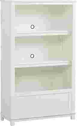 Sturdy and sweet, the Mila Place bookcase keeps any kids' space organized and tidy without sacrificing style. Crafted with pine solids and birch veneers and rendered in a fresh white finish, this versatile bookcase features two upper shelves and a lower catchall storage bin. Pass through holes in the rear panel offers the option of placing electronics on the shelves while keeping cords tucked neatly away.