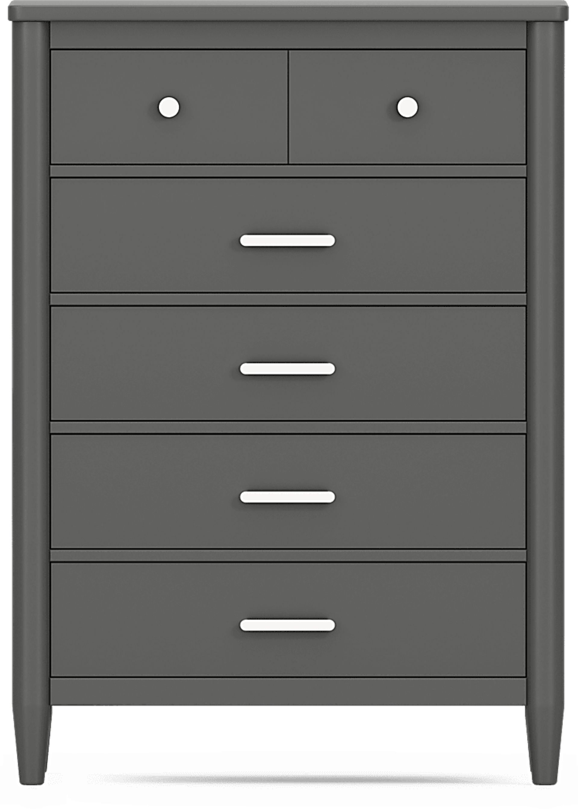 The ultimate style for your color obsession is finally here with the Modern Colors chest. Showcasing an iron ore finish, this piece balances ultra-sleek craftsmanship with an easygoing look. Each of the five drawers are sanded smooth to help store clothing, extra bedlinens and more. The drawers are crafted with front French dovetail joints and have ball bearing, side mounted glides. Knobs on the top drawer and pulls on the remaining four drawers are finished in brushed nickel. Brushed gold hardware is also included with purchase. Tapered spun legs supply the chest with a chic final touch.