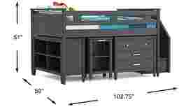 The ultimate collection for your color obsession is finally here with the Modern Colors full low loft bed. Showcasing an iron ore finish, each piece balances ultra-sleek craftsmanship with easygoing comfort. Featuring a full bed that sits lower to the ground than a traditional loft, this piece has a reversible staircase that can be affixed to either side of the bed. The steps feature storage drawers that are perfect for stashing away clothing, books and more. The coordinating loft chest has three drawers crafted with front French dovetail joints and ball bearing, side mounted glides. Soar through study time with the coordinating caster desk that can be wheeled out and around at a moment's notice. The desk even has a couple cubbies that are perfect for textbooks or homework supplies. A matching 52-inch bookcase can shelve books, comics, magazines, decor and more. The hardware is finished in brushed nickel but brushed gold knobs and pulls are also included with purchase. Mattress and foundation (if required) sold separately. This product requires a bunkie board (sold separately).