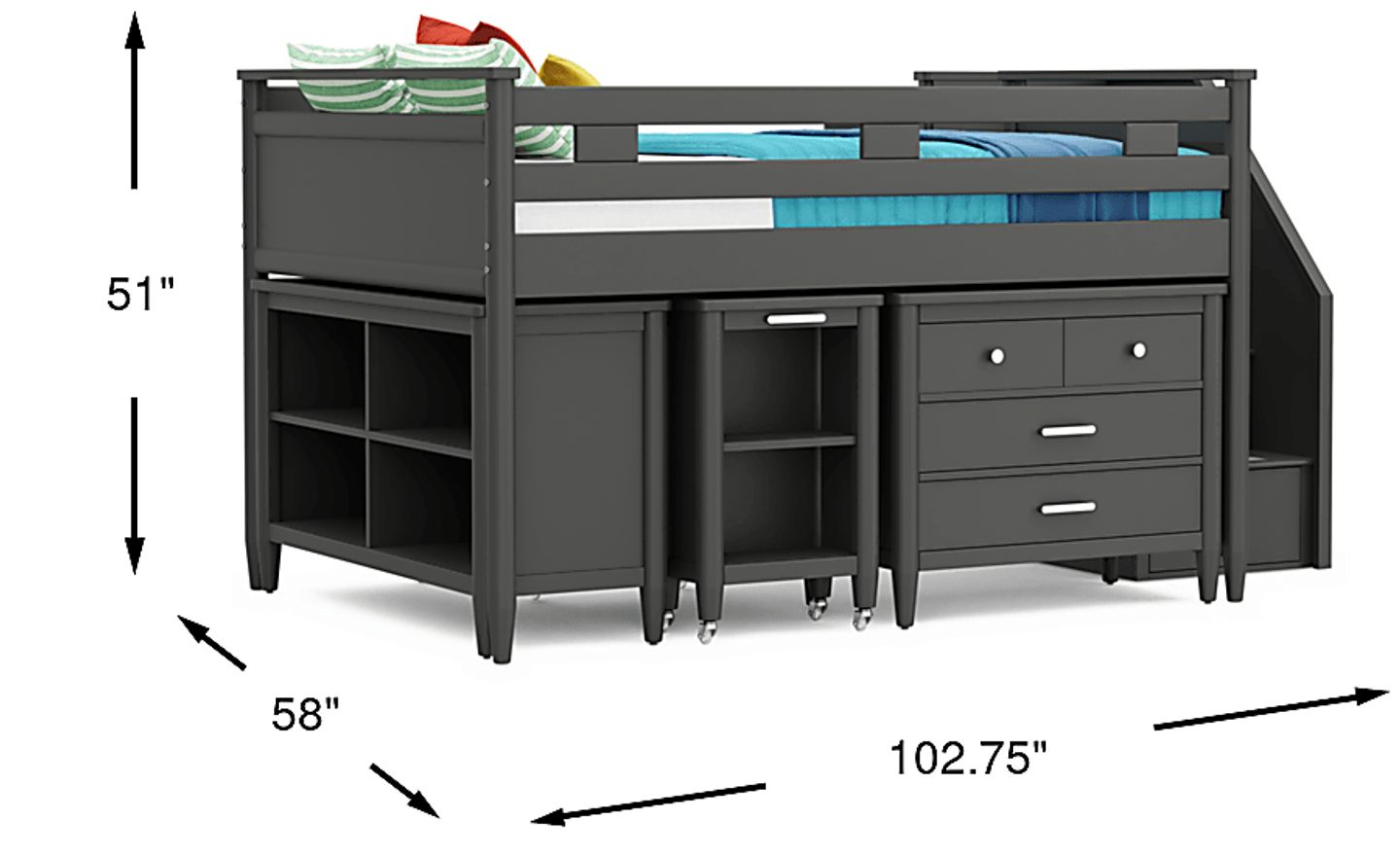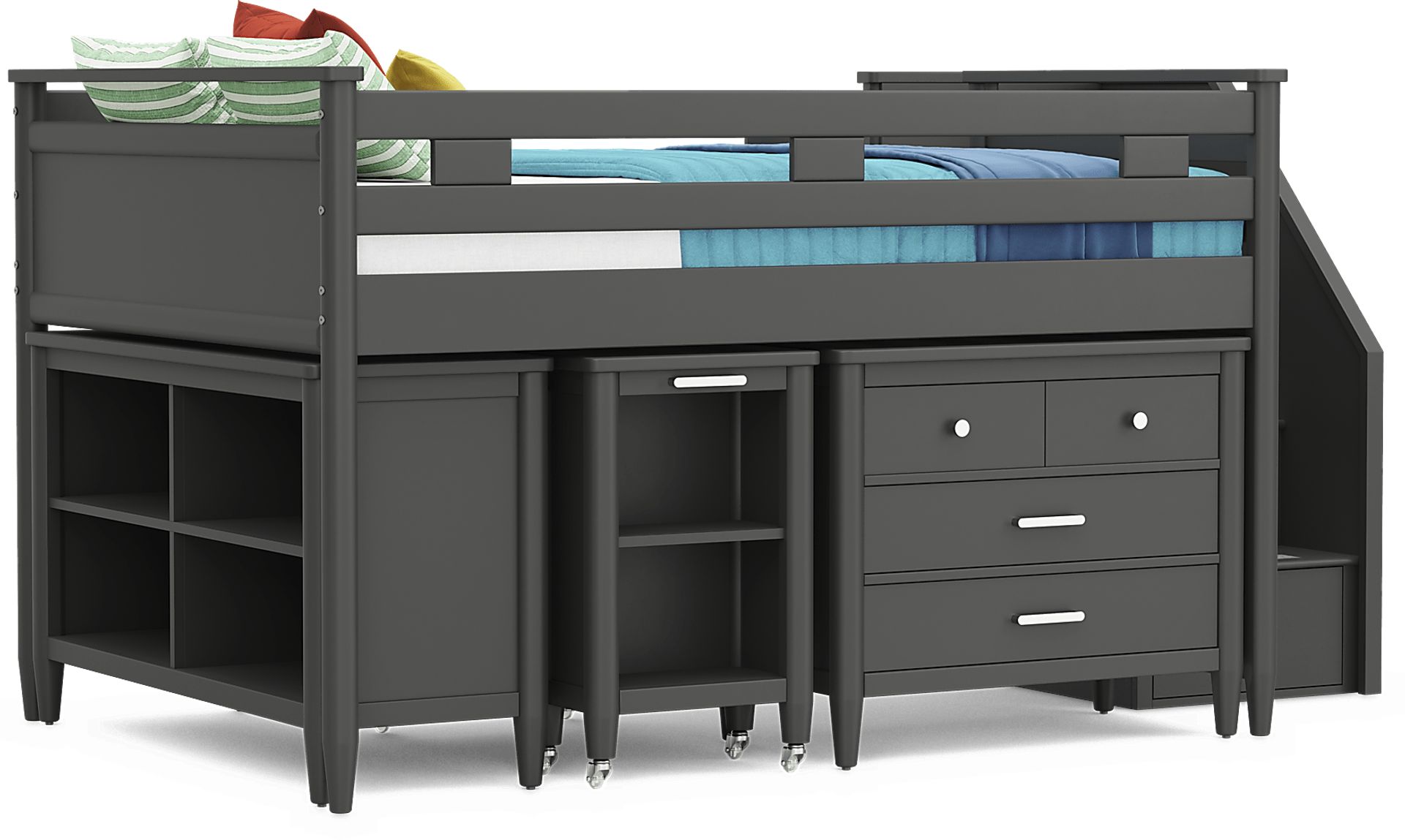 Kids Modern Colors Iron Ore Full Step Loft With Loft Chest, Bookcase And Desk