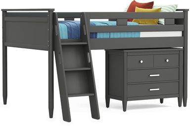 The ultimate collection for your color obsession is finally here with the Modern Colors full low loft bed. Showcasing an iron ore finish, each piece balances ultra-sleek craftsmanship with easygoing comfort. Featuring a full bed that sits lower to the ground than a traditional loft, this piece has a reversible staircase that can be affixed to either side of the bed. The steps feature storage drawers that are perfect for stashing away clothing, books and more. The coordinating loft chest has three drawers crafted with front French dovetail joints and ball bearing, side mounted glides. Soar through study time with the coordinating caster desk that can be wheeled out and around at a moment's notice. The desk even has a couple cubbies that are perfect for textbooks or homework supplies. A matching 52-inch bookcase can shelve books, comics, magazines, decor and more. The hardware is finished in brushed nickel but brushed gold knobs and pulls are also included with purchase. Mattress and foundation (if required) sold separately. This product requires a bunkie board (sold separately).