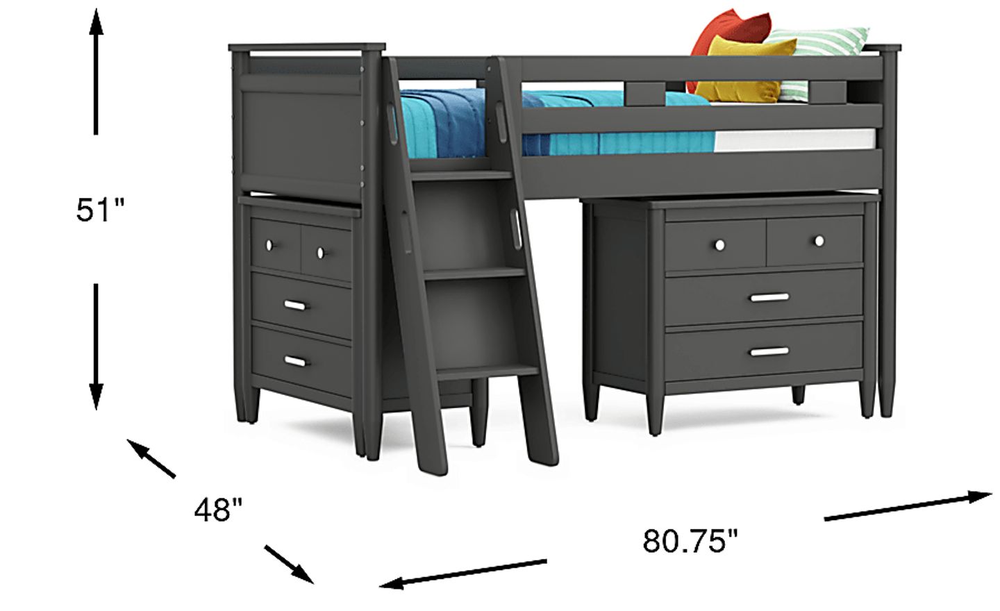 The ultimate collection for your color obsession is finally here with the Modern Colors twin low loft bed. Showcasing an iron ore finish, each piece balances ultra-sleek craftsmanship with easygoing comfort. Featuring a twin bed that sits lower to the ground than a traditional loft, this piece features a ladder that affixes to the side of the frame for three easy steps up and three easy steps down. Two coordinating loft chests have three drawers crafted with front French dovetail joints and ball bearing, side mounted glides. The hardware is finished in brushed nickel but brushed gold knobs and pulls are also included with purchase. Mattress and foundation (if required) sold separately. This product requires a bunkie board (sold separately).