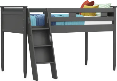 The ultimate collection for your color obsession is finally here with the Modern Colors twin low loft bed. Showcasing an iron ore finish, each piece balances ultra-sleek craftsmanship with easygoing comfort. Featuring a twin bed that sits lower to the ground than a traditional loft, this piece has a reversible staircase that can be affixed to either side of the bed. The steps feature storage drawers that are perfect for stashing away clothing, books and more. The coordinating loft chest has three drawers crafted with front French dovetail joints and ball bearing, side mounted glides. A matching 37-inch bookcase can shelve books, comics, magazines, decor and more. The hardware is finished in brushed nickel but brushed gold knobs and pulls are also included with purchase. Mattress and foundation (if required) sold separately. This product requires a bunkie board (sold separately).