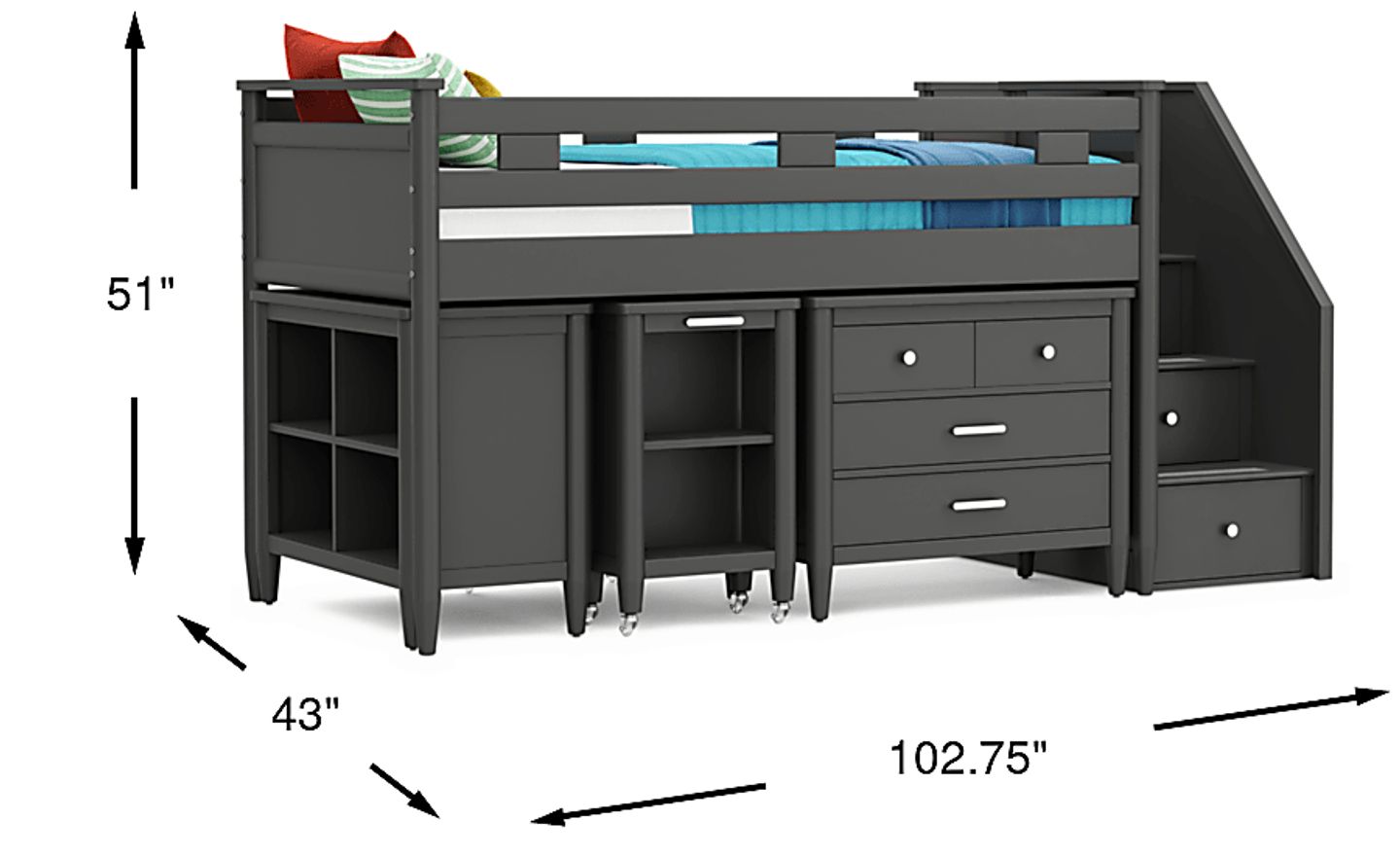 Kids Modern Colors Iron Ore Twin Step Loft With Loft Chest, Bookcase And Desk