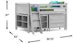 The ultimate collection for your color obsession is finally here with the Modern Colors full low loft bed. Constructed from poplar solids in light gray finish, each piece balances ultra-sleek craftsmanship with easygoing comfort. Featuring a full bed that sits lower to the ground than a traditional loft, this piece features a ladder that affixes to the side of the frame for three easy steps up and three easy steps down. The coordinating loft chest has three drawers crafted with front French dovetail joints and ball bearing, side mounted glides. Soar through study time with the coordinating caster desk that can be wheeled out and around at a moment's notice. The desk even has a couple cubbies that are perfect for textbooks or homework supplies. A matching 52-inch bookcase can shelve books, comics, magazines, decor and more. The hardware is finished in brushed nickel but brushed gold knobs and pulls are also included with purchase. Mattress and foundation (if required) sold separately. This product requires a bunkie board (sold separately).
