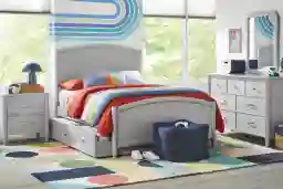The ultimate collection for your color obsession is finally here with the Modern Colors full panel bedroom. Showcasing light gray finish, each piece balances ultra-sleek craftsmanship with easygoing comfort. Subtle molding on the headboard boasts a gentle arch that is echoed by the bed's footboard. Adjustable side rails offer two heights for accessibility, making them easy to lower or raise as needed. The coordinating dresser has seven drawers to help store clothing, extra bedlinens and more. Each drawer has front French dovetail joints with ball bearing, side mounted glides. Knobs on the top three drawers and pulls on the remaining four drawers are finished in brushed nickel. Brushed gold hardware is also included with purchase. Tapered spun legs on the bed and dresser give both pieces a chic quality. The rectangular mirror with rounded corners adds a picture-perfect final touch when mounted to the dresser. Mattress and foundation (if required) sold separately.