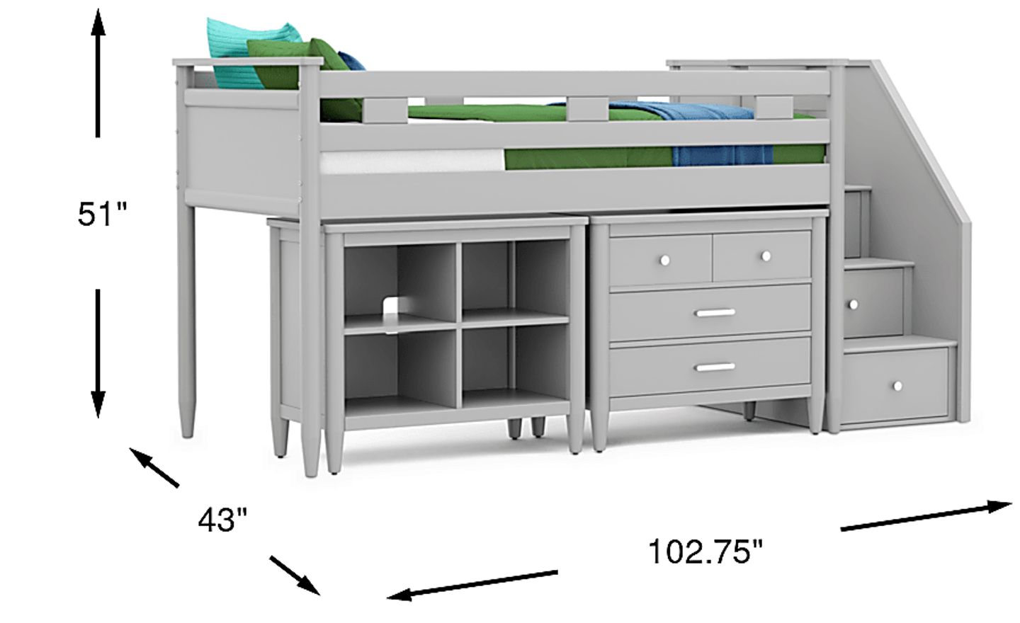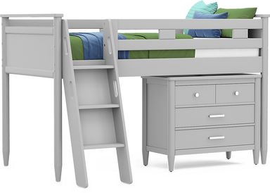 The ultimate collection for your color obsession is finally here with the Modern Colors twin low loft bed. Showcasing light gray finish, each piece balances ultra-sleek craftsmanship with easygoing comfort. Featuring a twin bed that sits lower to the ground than a traditional loft, this piece has a reversible staircase that can be affixed to either side of the bed. The steps feature storage drawers that are perfect for stashing away clothing, books and more. The coordinating loft chest has three drawers crafted with front French dovetail joints and ball bearing, side mounted glides. A matching 37-inch bookcase can shelve books, comics, magazines, decor and more. The hardware is finished in brushed nickel but brushed gold knobs and pulls are also included with purchase. Mattress and foundation (if required) sold separately. This product requires a bunkie board (sold separately).