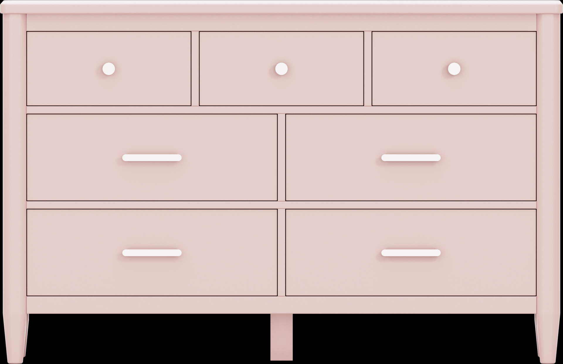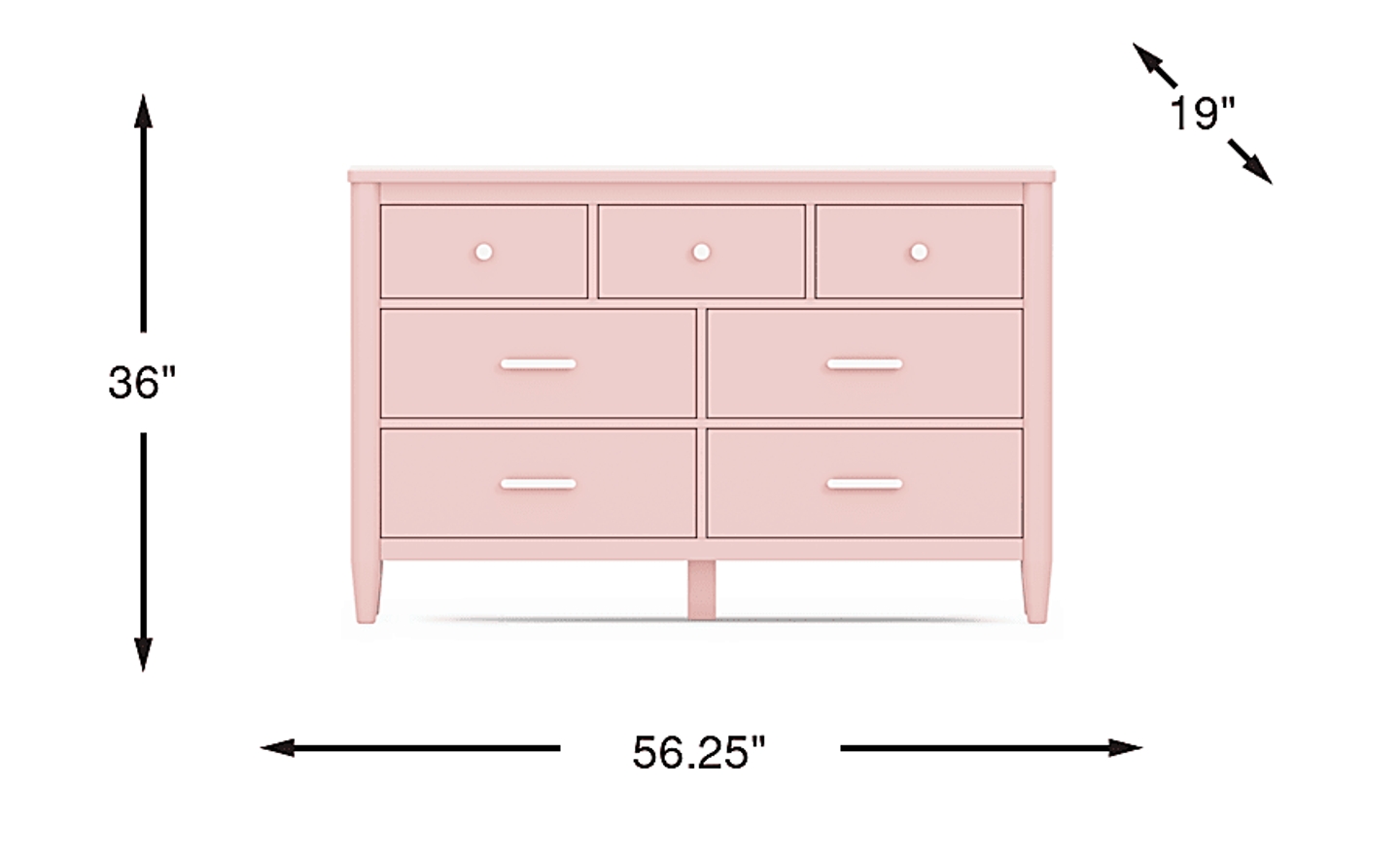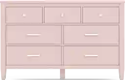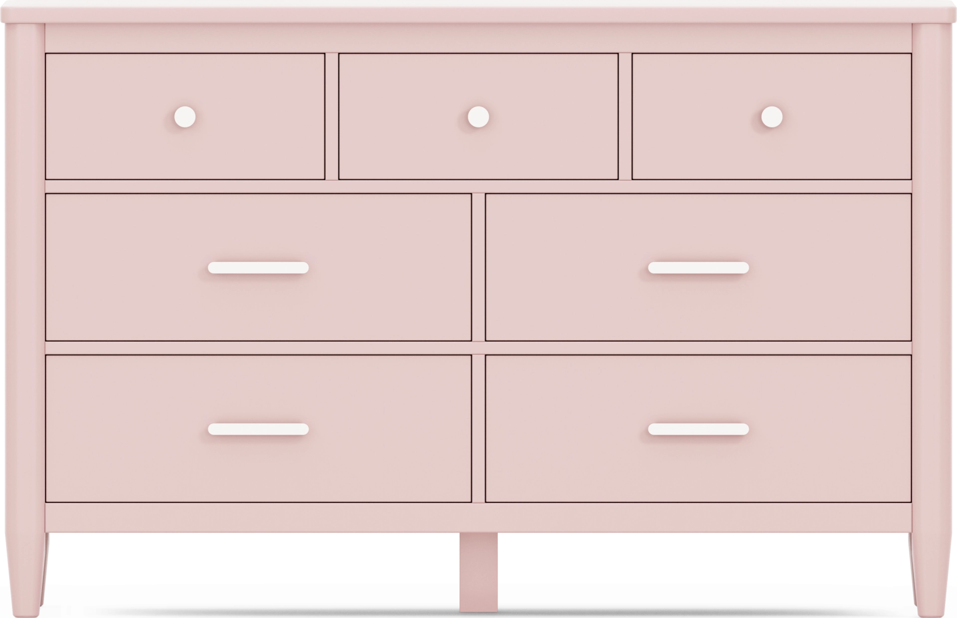 The ultimate style for your color obsession is finally here with the Modern Colors dresser. Showcasing pink finish, this piece balances ultra-sleek craftsmanship with an easygoing look. Each of the seven drawers are sanded smooth to help store clothing, extra bedlinens and more. The drawers are crafted with front French dovetail joints and have ball bearing, side mounted glides. Knobs on the top three drawers and pulls on the remaining four drawers are finished in brushed nickel. Brushed gold hardware is also included with purchase. Tapered spun legs supply the dresser with a chic final touch.