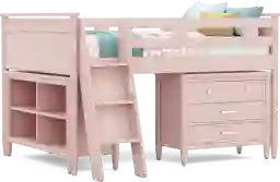 The ultimate collection for your color obsession is finally here with the Modern Colors full low loft bed. Showcasing pink finish, each piece balances ultra-sleek craftsmanship with easygoing comfort. Featuring a full bed that sits lower to the ground than a traditional loft, this piece features a ladder that affixes to the side of the frame for three easy steps up and three easy steps down. The coordinating loft chest has three drawers crafted with front French dovetail joints and ball bearing, side mounted glides. A matching 52-inch bookcase can shelve books, comics, magazines, decor and more. The hardware is finished in brushed nickel but brushed gold knobs and pulls are also included with purchase. Mattress and foundation (if required) sold separately. This product requires a bunkie board (sold separately).