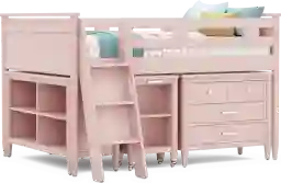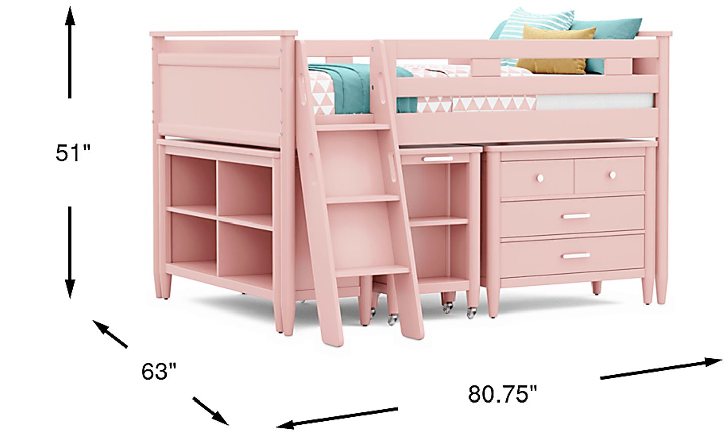 The ultimate collection for your color obsession is finally here with the Modern Colors full low loft bed. Showcasing pink finish, each piece balances ultra-sleek craftsmanship with easygoing comfort. Featuring a full bed that sits lower to the ground than a traditional loft, this piece features a ladder that affixes to the side of the frame for three easy steps up and three easy steps down. The coordinating loft chest has three drawers crafted with front French dovetail joints and ball bearing, side mounted glides. Soar through study time with the coordinating caster desk that can be wheeled out and around at a moment's notice. The desk even has a couple cubbies that are perfect for textbooks or homework supplies. A matching 52-inch bookcase can shelve books, comics, magazines, decor and more. The hardware is finished in brushed nickel but brushed gold knobs and pulls are also included with purchase. Mattress and foundation (if required) sold separately. This product requires a bunkie board (sold separately).