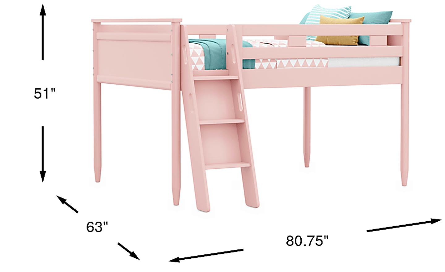 The ultimate collection for your color obsession is finally here with the Modern Colors full low loft bed. Showcasing pink finish, each piece balances ultra-sleek craftsmanship with easygoing comfort. Featuring a full bed that sits lower to the ground than a traditional loft, this piece features a ladder that affixes to the side of the frame for three easy steps up and three easy steps down. Mattress and foundation (if required) sold separately. This product requires a bunkie board (sold separately).
