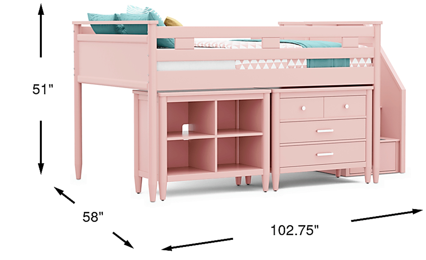 Kids Modern Colors Pink Full Step Loft With Loft Chest And Bookcase