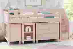 The ultimate collection for your color obsession is finally here with the Modern Colors full low loft bed. Constructed from poplar solids in pink finish, each piece balances ultra-sleek craftsmanship with easygoing comfort. Featuring a full bed that sits lower to the ground than a traditional loft, this piece has a reversible staircase that can be affixed to either side of the bed. The steps feature storage drawers that are perfect for stashing away clothing, books and more. The coordinating loft chest has three drawers crafted with front French dovetail joints and ball bearing, side mounted glides. Soar through study time with the coordinating caster desk that can be wheeled out and around at a moment's notice. The desk even has a couple cubbies that are perfect for textbooks or homework supplies. A matching 52-inch bookcase can shelve books, comics, magazines, decor and more. The hardware is finished in brushed nickel but brushed gold knobs and pulls are also included with purchase. Mattress and foundation (if required) sold separately. This product requires a bunkie board (sold separately).