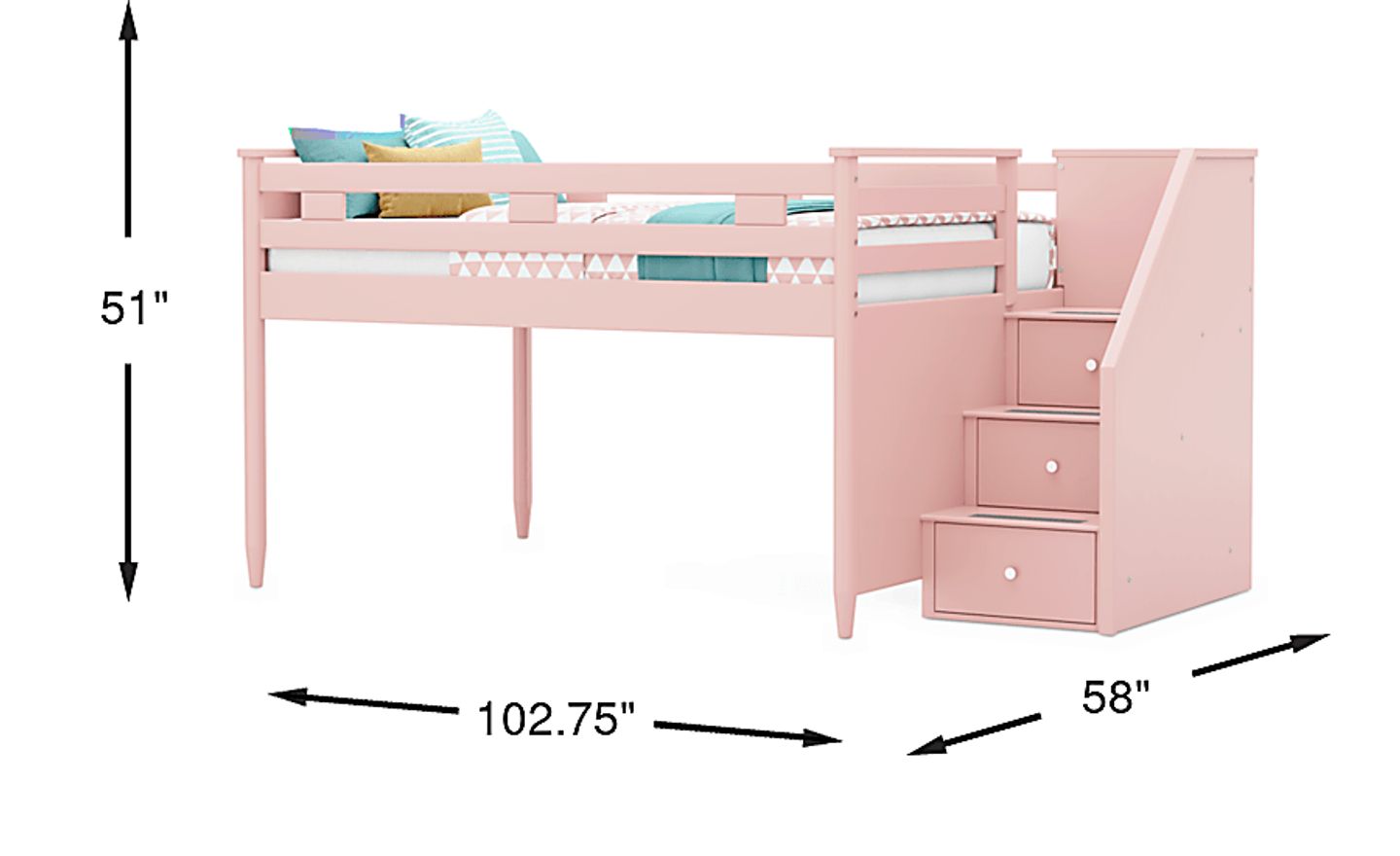 The ultimate collection for your color obsession is finally here with the Modern Colors full low loft bed. Showcasing pink finish, each piece balances ultra-sleek craftsmanship with easygoing comfort. Featuring a full bed that sits lower to the ground than a traditional loft, this piece has a reversible staircase that can be affixed to either side of the bed. The steps feature storage drawers that are perfect for stashing away clothing, books and more. Mattress and foundation (if required) sold separately. This product requires a bunkie board (sold separately).